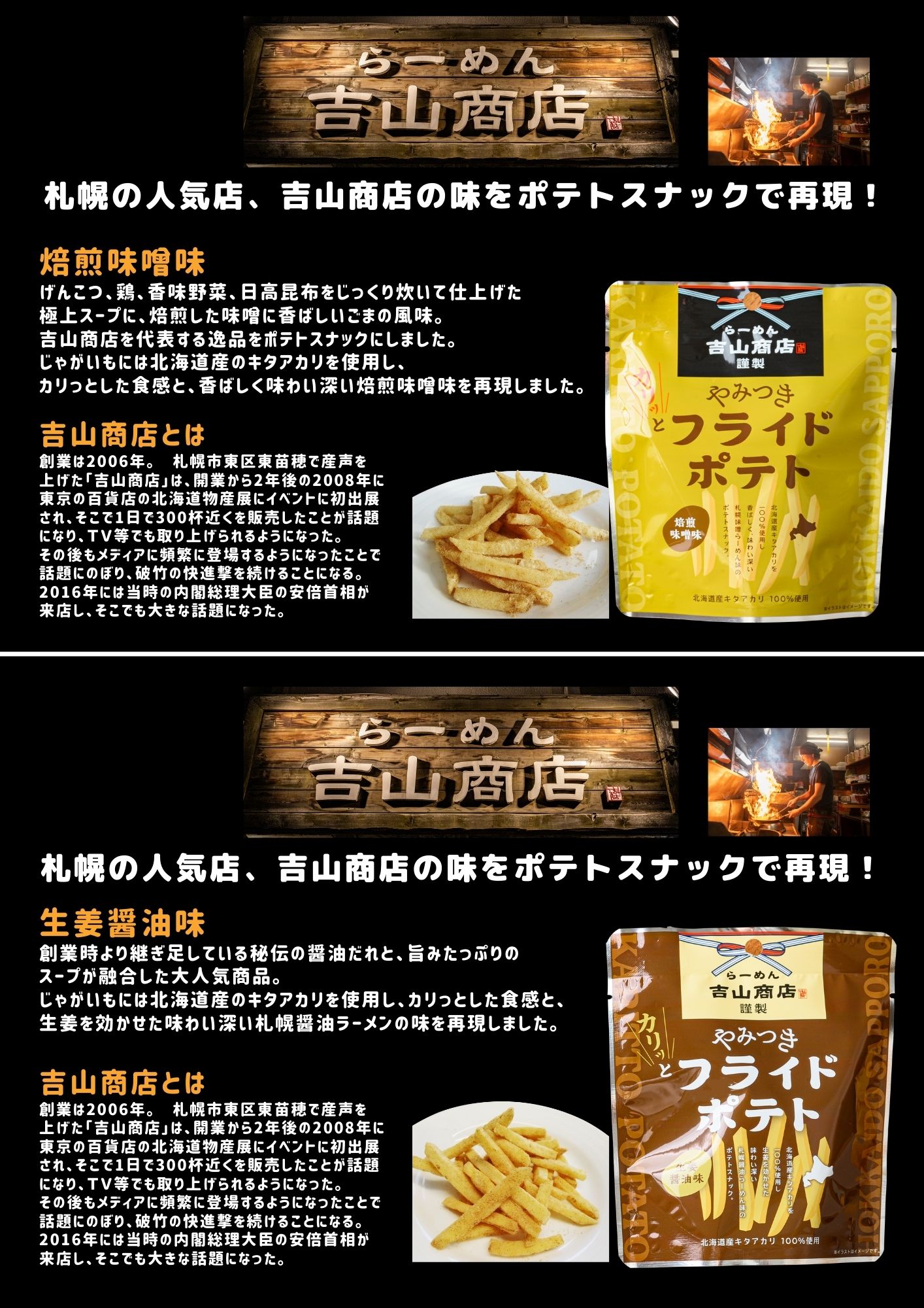 北海道産キタアカリを100%使用し香ばしく、味わい深い札幌味噌らーめん味の ポテトスナック。北海道産キタアカリ100%使用の焙煎味噌味です。