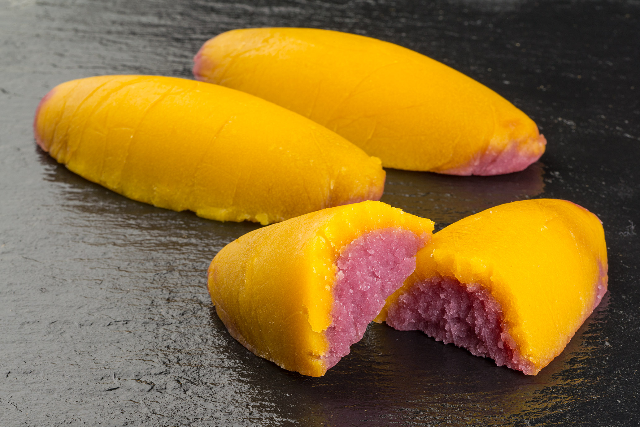 国産のさつまいもと紅芋、2種類の生地を使用し作り上げるスイートポテト。2色の見た目も美しく、甘さ控えめの上品な味わいです。縁起のよい商品名は、プレゼントにピッタリ。