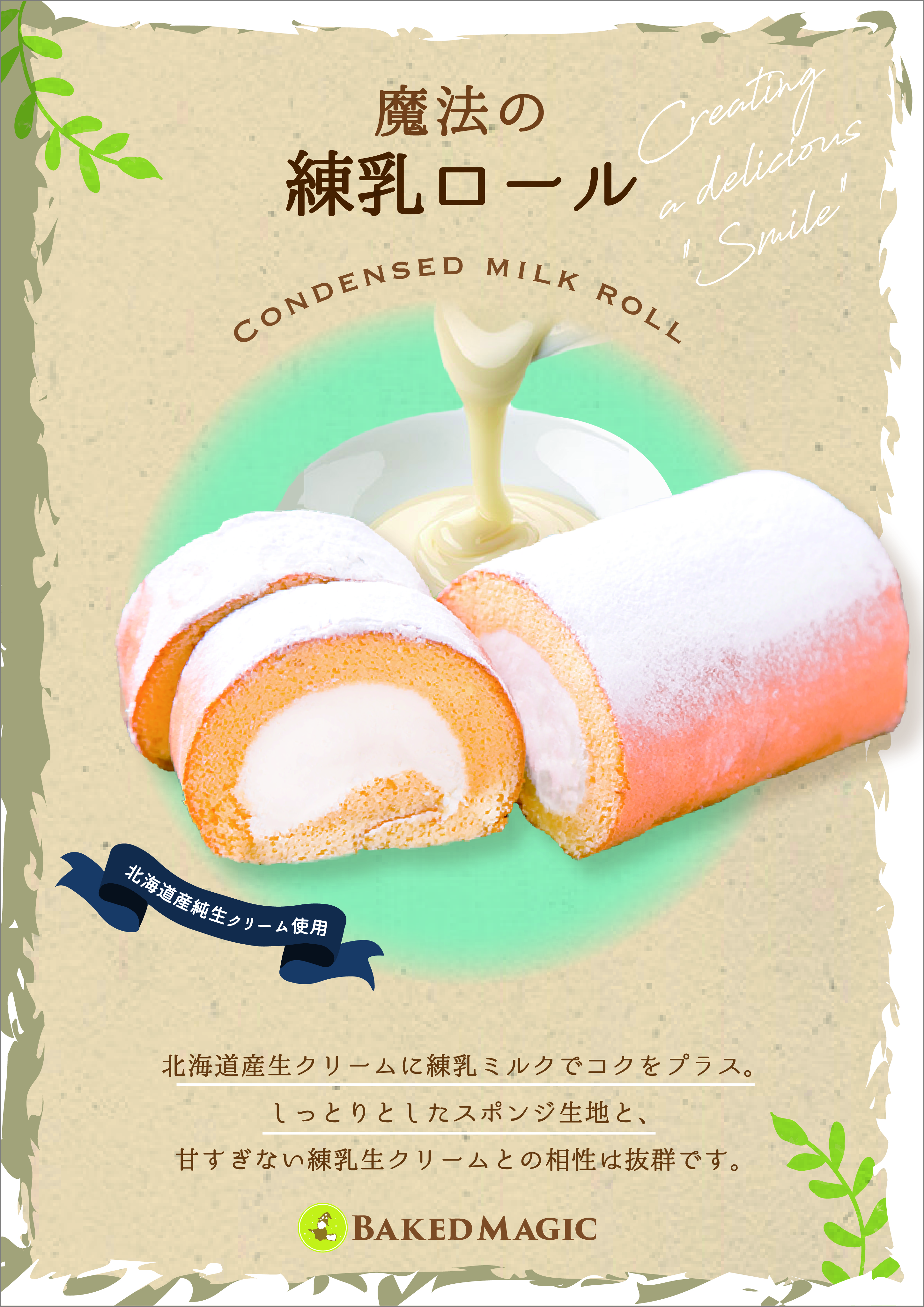 ベイクドマジックのロングセラー。北海道産の生クリームに、練乳ミルクを加えて、オリジナルブレンドしました。しっとりしたスポンジ生地と甘すぎない練乳生クリームが絶妙なハーモニーを醸し出したスイーツになっています。