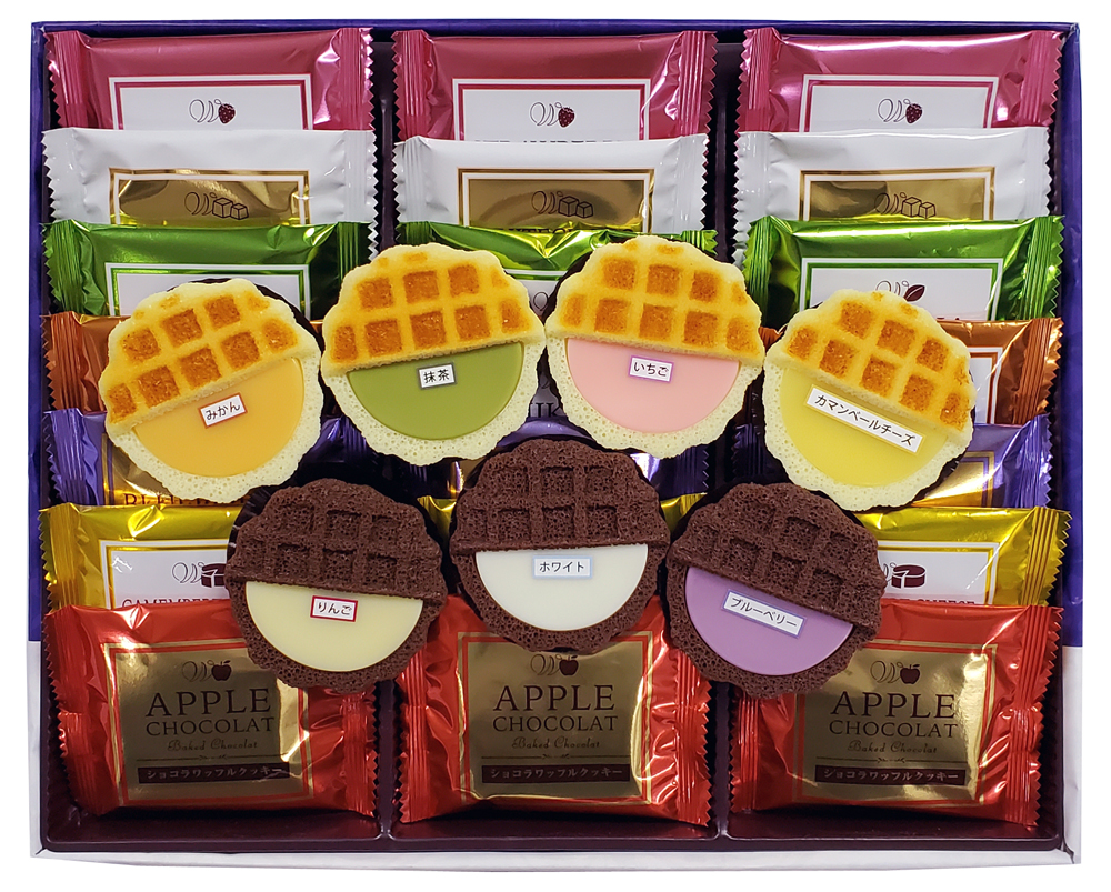 サクサク食感のワッフルクッキー2種(プレーン、ショコラ)に7種類(チーズ、抹茶、いちご、みかん、リンゴ、ホワイト、ブルーベリー)のチョコクリームをサンドしました。