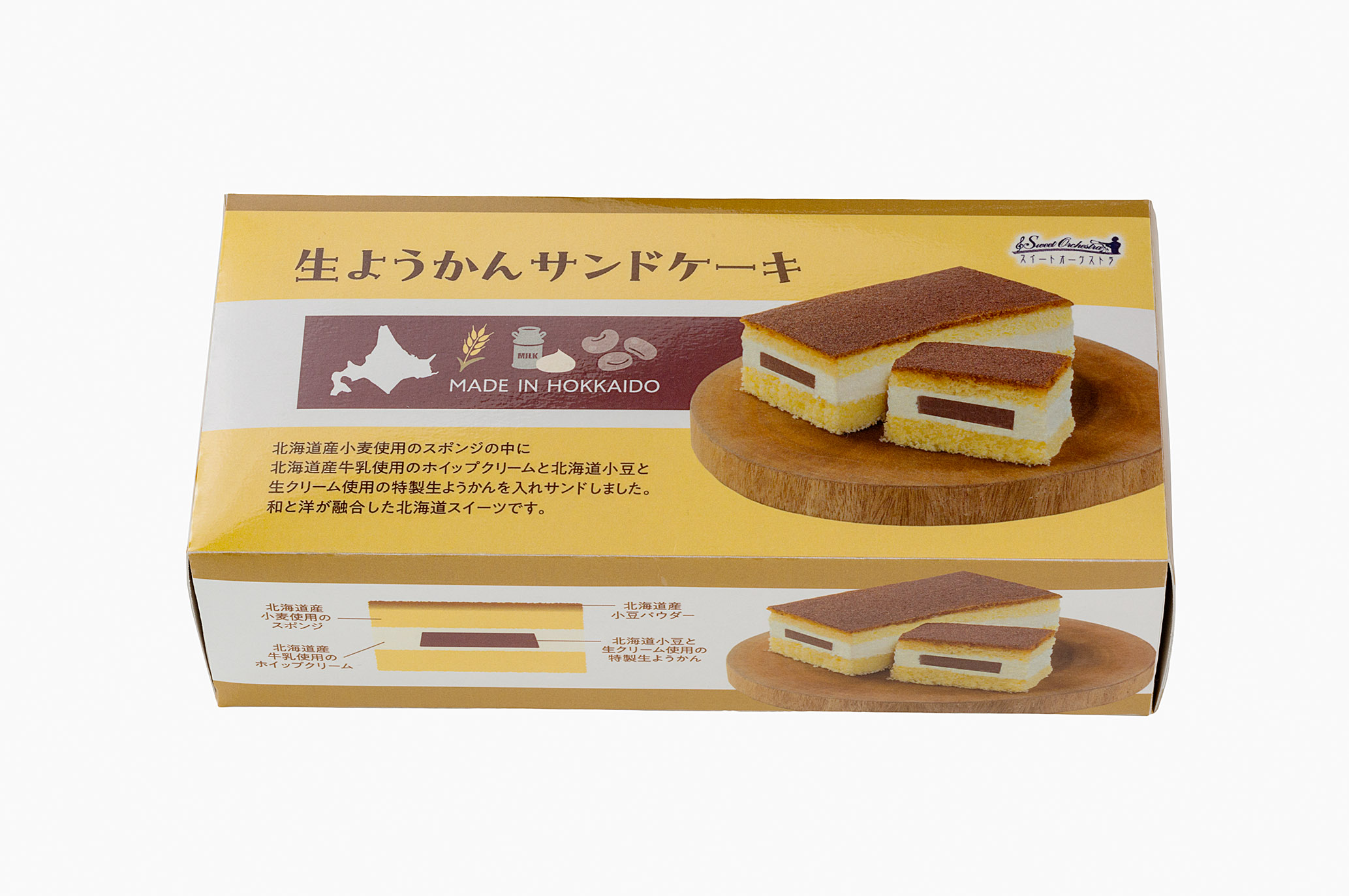 北海道産小麦使用のふわふわスポンジで挟まれたホイップクリームの中に、北海道産小豆と生クリームで作った羊羹をサンドしました。菓子「シベリア」を更に洋風にアレンジした商品です。